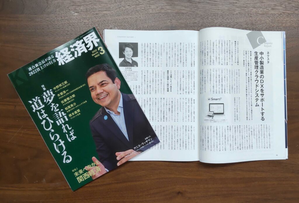 カンパニーレポート「中小製造業のDXをサポートする生産管理クラウドシステム」として、弊社製品の生産管理クラウドシステム「スマートF」の紹介と永原の想いが書かれています。