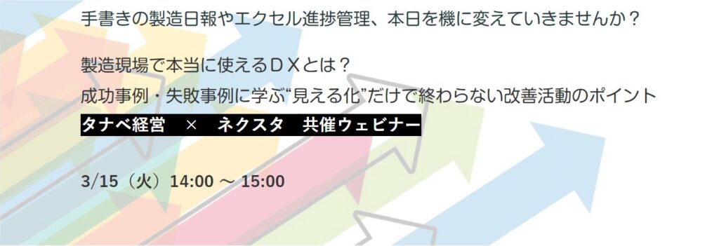 タナベ経営ドメインコンサルティング大阪本部・神高弘樹氏と弊社・永原が、生産改革のための具体的な課題抽出、改善策の立案、改善案実施までの進め方を解説。そして、現場における生産計画・品質管理・在庫管理など、課題解決のためのITツールを、取り入れやすいスモールスタートでの運用方法からご紹介します。